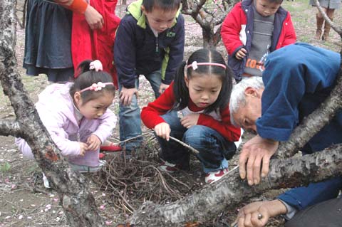 近日,在北洋镇长潭水库边上的500亩桃花园内,一些小朋友正在专心致志地看果农捉虫子。连日天气晴好,不少家长带着孩子来到这里,感受明媚的春光和清新的空气,使孩子们真正体验与大自然零距离的接触。