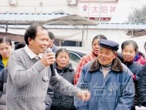 11月6日晚上,黄岩区宁溪镇上宅居农民喻圣山来到该镇前垟村,在戏开演前上台表演了自编的“黄岩白搭”:《歌颂十七大》。喻圣山从小就喜欢文娱活动,近年来在各地村居、街头自编自演文艺节目。党的十七大闭幕后,他立即自编节目到农户及街头演出,受到广大群众欢迎。6日当晚演出后,当地群众又约他7日晚上再演一场。这是喻圣山在街头演出的情景。