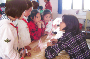 4月24日下午,黄岩区妇联带着保健医生、英语辅导老师,还有心理专家、法律专家等有关人员来到黄岩茅畲逸夫学校,向该校的留守儿童发放了阳光援助卡,凭卡他们可获一些生活上的帮助。图为专家和老师们与留守儿童面对面交谈,深入了解和沟通。