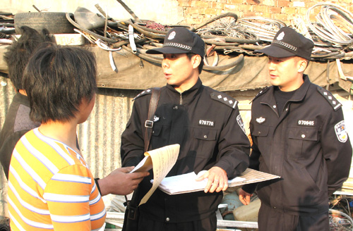 4月29日下午,民警正在一废旧物品收购点对收购登记情况进行严格检查。据了解,从4月中旬开始,黄岩区公安分局城西派出所对辖区内100余家废旧金属收购点(包括流动收购)开展为期一个月的集中整治,严格规范废旧金属收购业经营秩序。