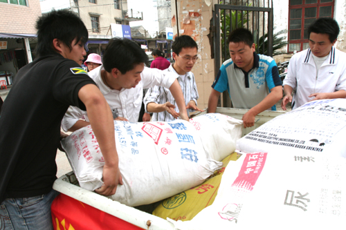 5月4日上午,来自区农业局、区广播电视台、头陀镇和北洋镇的60多名青年志愿者到头陀、北洋等地开展心连心扶贫帮困“三下乡”活动,志愿者们先后走访了两镇的部分种粮大户和贫困农户,给他们送去化肥3吨。同时,他们还开展“送维权服务下乡”活动,为当地农民提供科技咨询和维权投诉。图为志愿者们为农户送去化肥。