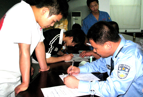 5月6日晚上,城西派出所民警在东路村为外来务工者办理暂住证。今年以来,城西派出所推行上门办证服务,组织民警利用晚上时间深入到辖区内各企业和外来人员住宿点现场办理暂住证。到目前,该所辖区内已有1万余名外来务工者不出“家门”就领到了自己的暂住证。图为民警正在东路村为外来务工者办证。