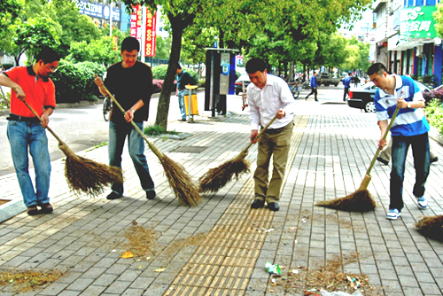 机关干部清扫人行道