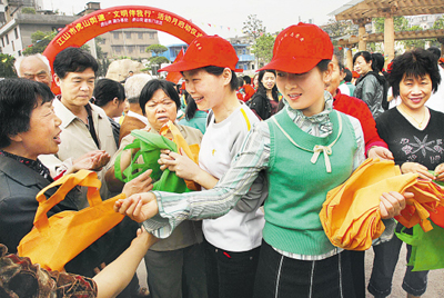 昨天上午,一些志愿者在江山市文化广场向市民免费赠送环保袋。当天,江山市虎山街道启动“文明伴我行”活动,五百多名志愿者上街向市民发放文明倡议书,劝阻过往市民的不文明行为。