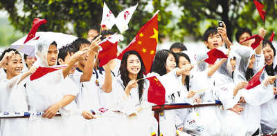 5月10日,汕头市民在雨中为奥运圣火传递加油。