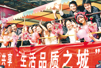 昨天,来自全国20个省、区、市的百对外来新人共同参加第四届杭州外来务工青年大型公益集体婚礼。图为新人们乘花车快乐巡游。