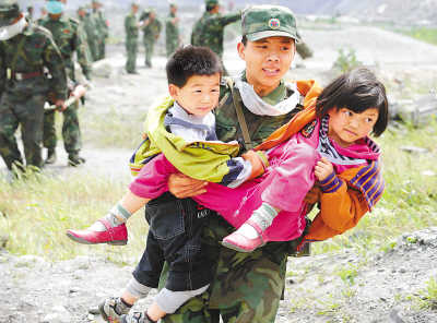 5月16日中午,汶川地震震中区映秀镇数百名受伤灾民乘军用直升机撤离,前往成都接受救治。图为解放军战士正在往直升机上送两名受伤儿童。
