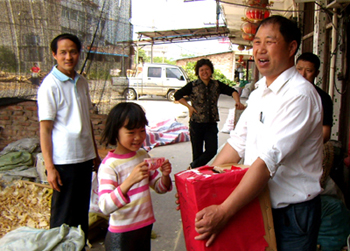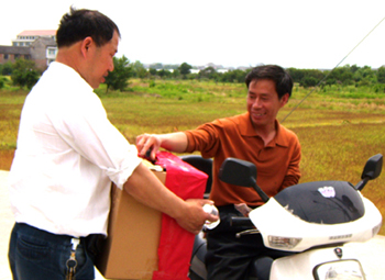 村民骑车追上村干部捐款。