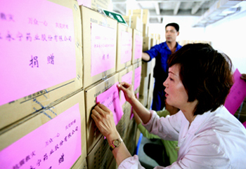 捐赠的药品装车后送往灾区。