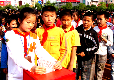 昨天下午,黄岩区滨江小学1000来位师生怀着沉重的心情通过默哀、朗诵、写祝福语和捐款等活动来表达对灾区人民的祈福和援助,本次活动共募捐了76322.72元,他们希望能用自己的绵薄之力帮助灾区人民早日重建家园。图为该校学生正在进行捐款活动。