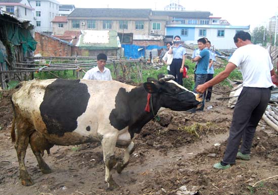 5月26日下午,西城街道后洋村养牛场里的7头奶牛告别生活了10多年的城区,搬到金清农村去安家。从此,养牛场周边群众再也不会为环境脏而叫苦了。