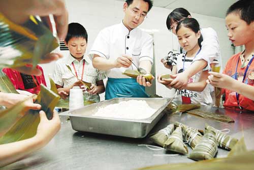 端午节即将来临,浙江大学饮食服务中心组织外来工子女参观图书馆、学习包粽子。其中有两位来自灾区的孩子,他们的父母都在服务中心工作,家里的房子都震垮了。