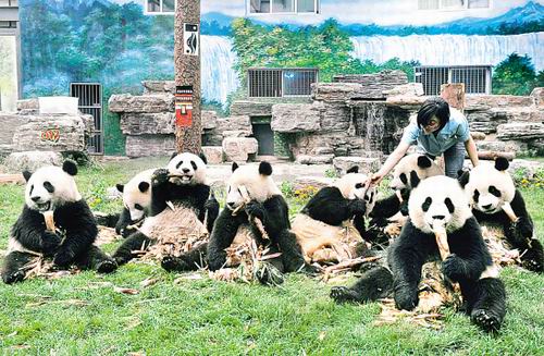 6月2日,饲养员在给8只“奥运熊猫”喂竹笋。当日,北京动物园召开新闻发布会宣布:8只“奥运熊猫”将在6月5日正式对外展出,与广大游客见面。据悉,这8只大熊猫是卧龙自然保护区从地震灾区疏散出来后,乘专机抵达北京的。在参加一系列预定活动后,它们将于11月返回家乡四川卧龙—中国保护大熊猫研究中心。