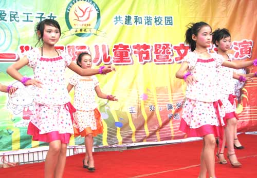 6月6日下午,三友小学特别热闹,900多位学生围坐在一起观看以“庆‘六一’、迎奥运”为主题的文艺汇演。演出节目均由学生们自编、自导、自演,有舞蹈、小组唱唱等,其中来自地震灾区的3位学生一起合唱了歌曲《让世界充满爱》。现场还有老年大学的艺术团的老同志们为孩子们表演越剧说唱等节目。图为小学生正在表演舞蹈《眉飞色舞》。