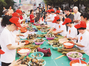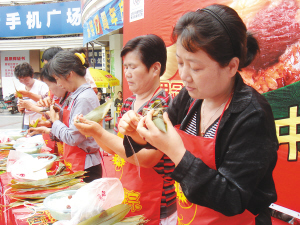 6月1日下午,黄岩区东城街道山亭社区与世纪联华超市联合在该超市门口广场上举办山亭社区第五届邻居节。在本次邻居节上举行了以“粽香飘万家、传递奥运情”为主题的包火炬粽比赛。图为选手们正在包火炬粽比赛。