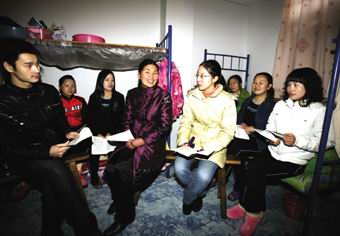 2月18日下午,东城街道工作人员孙沈慧(右四)在红三村外来人员宿舍宣讲十七大精神,与外来人员畅谈学习体会。在十七大精神主题宣传教育活动中,我区开展了“人人都是党的宣传员”活动,机关干部纷纷进村入户,以微型党课的形式,扩大十七大精神的教育覆盖面和知晓率,保证主题宣传教育不留死角。