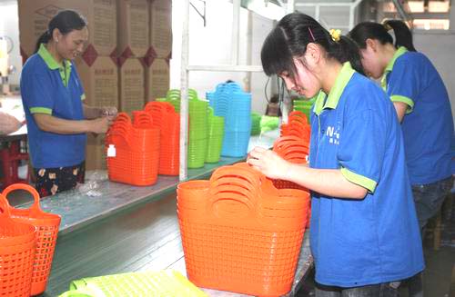 7月7日上午,在黄岩南峰日用品有限公司包装车间,几名员工正在为塑料菜篮粘贴出厂标签。受“限塑令”影响,该公司塑料菜篮比去年同期销售量上升一倍。