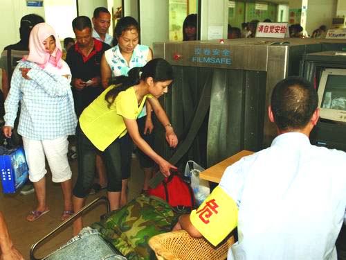 昨天上午,几名旅客正在台州客运西站安检处排队领取行李。随着奥运临近,西站采取有效措施,避免或减少安全事故发生,确保奥运期间安全。