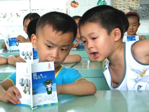 2008奥运会即将来到,黄岩城关慈光幼稚园的小朋友已经开始积极“备战”了。他们积极学习奥运礼仪,相互之间交流所学的、所看的,观看比赛时什么能做,什么不能做,需要注意哪些礼仪等等。图为7月20日,两个小朋友正在学习礼仪知识。