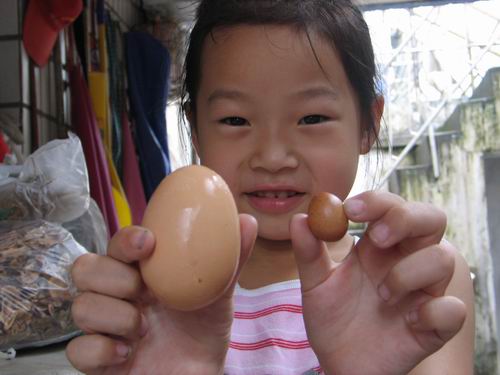 在东城街道城外洲社区王女士家中,一只大母鸡在一星期前竟产出两只微型鸡蛋,其中最小的鸡蛋长2.2厘米,宽1.7厘米。比正常的鹌鹑蛋还要小。据了解,该母鸡在一个月前曾经下过一个长约10厘米,宽近6厘米的大鸡蛋。