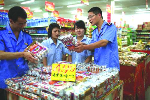 7 月21日下午,区工商分局执法人员正在一超市检查食品安全。奥运临近,近阶段我区有关部门组织开展了夏季食品安全大检查活动,确保群众买到放心食品。
