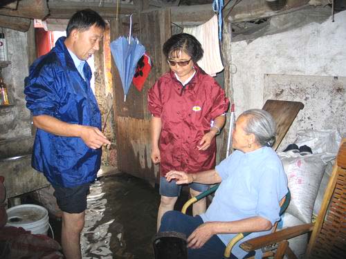 7月29日,受“凤凰”台风暴降雨影响,东城街道部分社区和村庄大面积受淹,当天下午,东城街道领导和村社(居)干部到各受淹的村社(居)帮助群众转移受淹物资、转移受淹的孤寡老人以及开展泻洪排涝等工作。图为山亭社区工作人员正在转移受淹的老人。