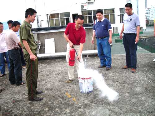 图为安全员们在专业消防人员的指导下使用灭火器进行灭火演练。