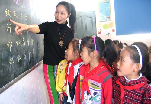 今天是第28个“世界粮食日”,滨江小学开展主题为“爱惜粮食,从我做起,从小做起”的爱粮节粮宣传活动。图为一(3)班马老师正在教小学生朗诵唐诗《悯农》。
