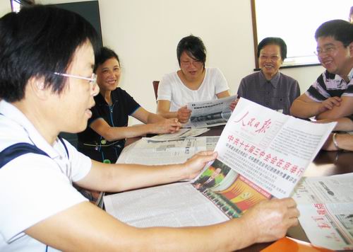 今天上午,东城街道山亭社区退休老党员符菊芹正在给村民党员们一起学习党的十七届三中全会精神。该社区从2004年开始成立了“党员活动日”后,他们将每月举行一次党员活动。期间,他们都将对国家的新政策、社会新信息进行解读交流,从而进一步促进广大党员全面参加国家政策的宣传和解读。