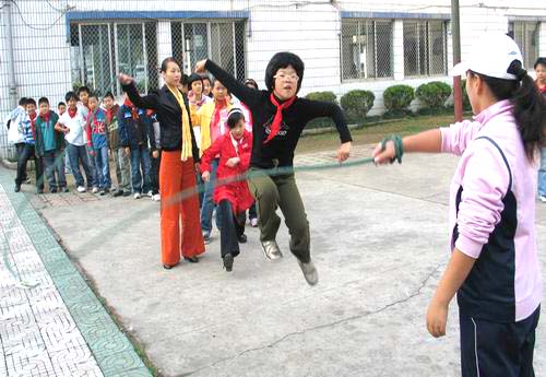今天上午,黄岩新东方外国语学校的小学生正在操场上进行跳长绳活动。据了解,该校本学期开展了“学习奥运精神,走进阳光体育”活动,活动的内容包括搬运接力\跳绳比赛、呼啦圈比赛、走高跷、跳橡皮针、打篮球等一系列比赛活动,学生们将利用早晨、课间、中午、下午等时间进行练习,进一步提高小学生的身体素质。