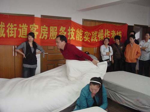 10月31日下午,为期七天的西城街道客房服务技能培训班圆满结束,60名学员全都顺利通过了理论知识和实践操作考核。图为学员正在进行叠被、铺床、套枕等实践考核。