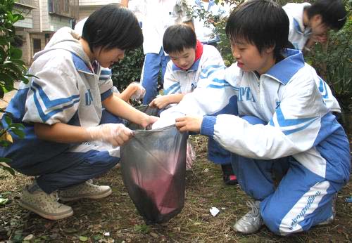 11月5日下午,黄岩区东城街道东浦中学组织50多位学生来到海棠新村开展“我为环保出份力”活动。他们对该社区内绿化带和道路上的垃圾杂草、楼道里的牛皮廨进行全面清理,同时对居民和行人进行环保意识宣传。图为东浦中学学生正在清理绿化带上的垃圾。
