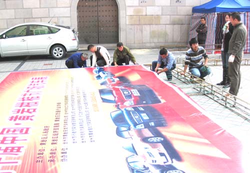 今天下午,黄岩柑橘节广场汽车展的准备工作正在紧张有序的进行着。据悉,汽车展共设有11个展位,有奔驰、大众、丰田等11个国内外汽车品牌的几十款车型,届时还会有文艺 演出、抽奖等吸引消费者的环节。图为工作人员正在安装展牌。