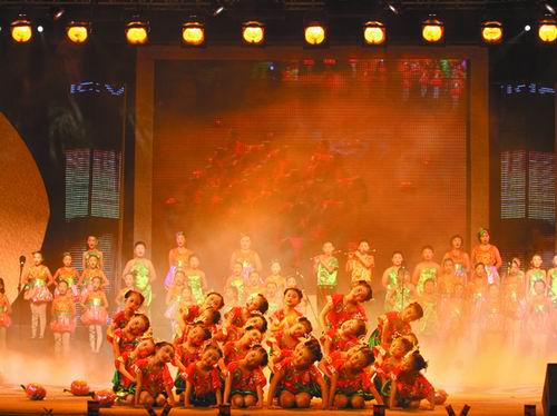 11月23日晚上,黄岩区纪念改革开放三十周年大会暨第十届中国·黄岩柑橘节文艺晚会在黄岩体育馆举行。图为黄岩欢乐少儿合唱团、黄岩蕾格舞蹈艺术中心表演的歌舞《最甜的橘子在黄岩》。