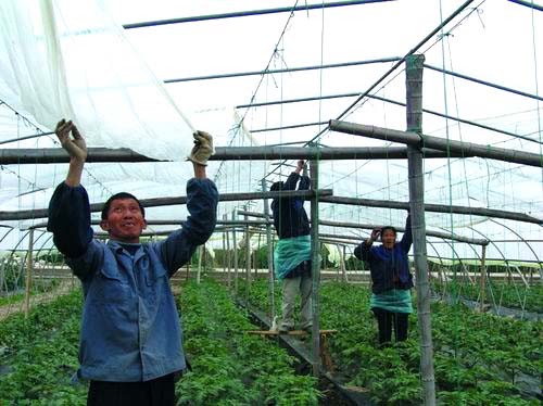 受北方冷空气影响,气温将下降。为了应对寒流,日前,院桥镇的广大番茄种植户一大早就在大棚内为番茄加盖上塑料薄膜,为大棚番茄穿上“防寒服”保暖,以防止番茄遭受冻害。