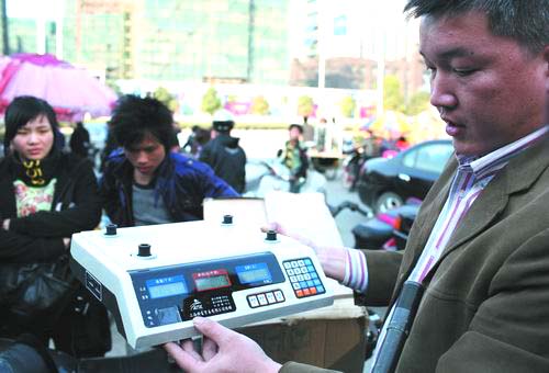 近日,区质监分局根据群众举报,在城区查获一批“8两秤”。这批“8两秤”是不法商贩通过违法手段,将电子秤电子芯片进行修改,以达到缺斤少两的目的。图为质监工作人员正在检查不合格的电子秤。