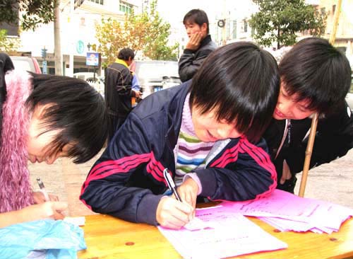12月13日上午,几名学生在横街路广场郑重地写下自己的环保感言。当天上午,由市环保志愿者协会青年服务队组织的“滴水行动”在横街路广场举行,很多市民纷纷在卡片上写下自己的环保感言。