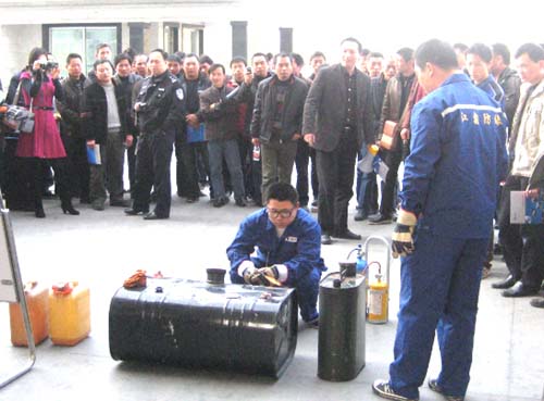 最近,一项阻隔防爆新技术在黄岩江鑫防爆科技有限公司研发成功。据了解,此项由江鑫防爆科技有限公司与清华大学等国内权威机构合作开发的最新成果,具有防爆、阻燃、消除静电等优点,尤其是在汽油和化工行业得到广泛应用。图为江鑫公司工作人员现场做带火加油演示。