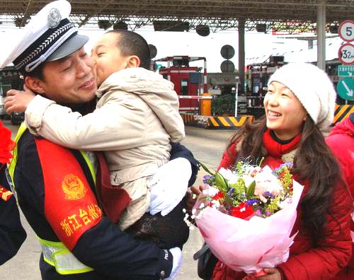 12月23日上午,黄岩公安分局及交警大队举行隆重欢迎仪式,迎接赴川援建的3名勇士凯旋归来。鲜花簇拥下,与丈夫阔别了整整100天的家属们喜极而泣,勇士王金亮的6岁儿子紧紧地把小脸,贴到爸爸那张布满风尘的面颊:“我天天在数数,数着爸爸回家的日子。”
