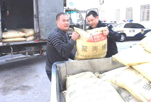 黄岩公安分局十分重视对于关系群众利益的盗窃、抢劫案件的侦破,同时更加重视破案后的追赃工作,尽可能为群众减少损失。图为该局刑侦大队在破案后及时追回赃物,将被盗的塑料原料发还给失主的情景。