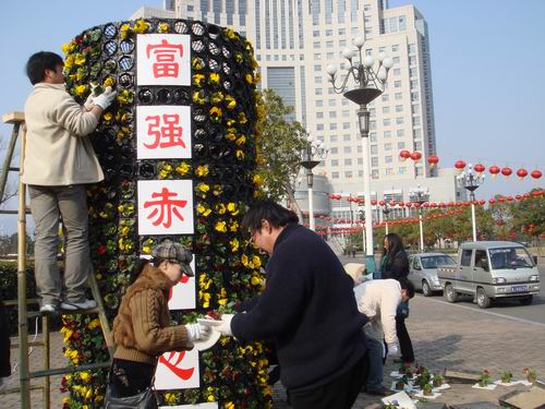 “丰稔黄牛志,富强赤子心。”区行政大楼南大门前的一幅“对联”格外引人注目,图为区园林管理处职工与工人一起用鲜花点缀美丽的黄城。牛年的脚步越走越近,我区大街小巷都开始沸腾起来,节日氛围营造工程也不禁加快了速度。