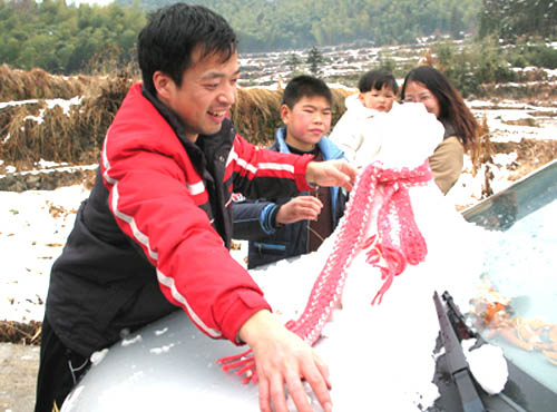 新年的第一场雪让游客们欣喜不已。在黄岩区平田乡南片公路上,许多驾车来到该乡桐树坑村参观中共台属特委机关旧址纪念馆和游览“浙东十八潭”景区的游客们,在回家途中被那里的雪景所吸引,纷纷停车路边,在车背上堆起“雪人”载回家。