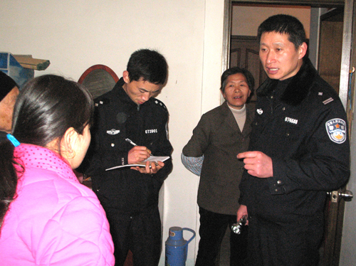 在“大走访”爱民实践活动中,浙江省台州市黄岩区公安分局城西派出所针对辖区群众白天上班不在家的实际情况,组织民警利用中午、晚上时间深入村(居)开展大走访工作,广泛听取群众的意见和呼声,同时向群众宣传法制和安全防范常识,指导家庭落实好安全防范工作。图为2月24日晚上该所民警正在大树下村征求群众对派出所工作的意见和建议。