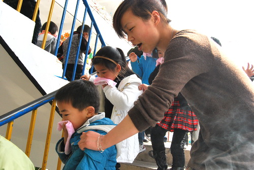 图为小朋友们在演练中用湿毛巾捂住口鼻沿宿舍楼道“逃生”的情景。