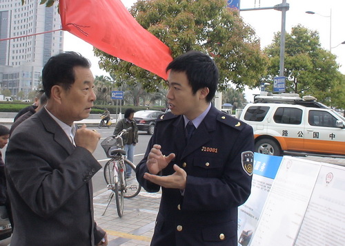4月1日,黄岩公路部门数十执法人员走上街头,走近企业,揭开了“路政宣传月”活动的序幕。此次活动主要就群众关心的“分车型限速的实施在充分发挥道路资源中的作用”、“计重收费”、公路违法行为的种类、危害与处罚措施等,聆听群众及相关企业主的看法与意见,全面增进互动,实现路政管理工作深入人心。图为路政执法人员在黄岩北门广场为过往行人详细解答群众关于路政管理的相关问题。