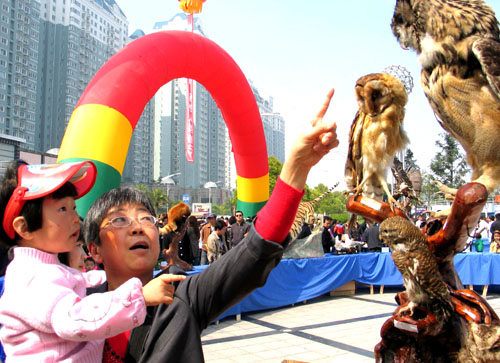 4月11日上午,“陆生野生动物保护宣传月暨爱鸟周活动”在黄岩永宁公园联合开展,活动包括鸟类标本展、散发宣传资料、环保课本剧演出、我对小鸟说句话、为小鸟建窝和放飞鸽子等一系列活动,倡导市民保护周围的候鸟,提高广大市民爱鸟的意识。图为黄岩市民们正在参观鸟类标本展。