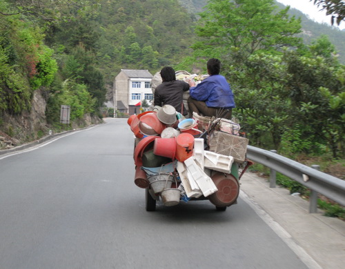 一辆开得飞快的电动三轮车,装了满满一车的回收垃圾,上头居然还坐了两个人。近日,网友“游游”在长潭水库沿岸公路上目睹这摇摇晃晃的一幕,不禁为那俩“乘客”担心。这是条弯弯曲曲的沿岸公路,危险系数大,加之车上装了这么多轻轻重重的垃圾,人坐其上,命悬一线啊!