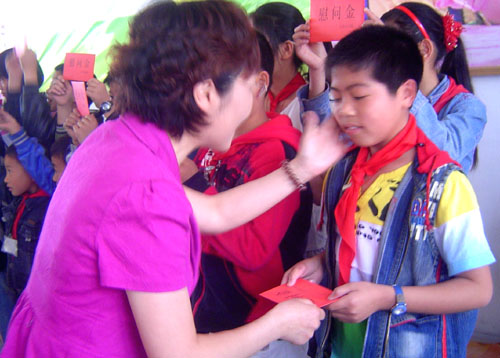 图为市妇联领导向“留守儿童”赠送慰问金时的情景。