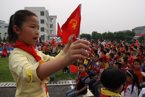 昨天上午,黄岩区东城街道镇东小学举行以“歌唱祖国歌唱党——快乐童年大家唱”为主题的庆六一红歌拉唱比赛,全校1000多位师生手拿小红旗,以班级为单位开展了革命歌曲拉唱比赛,吸引了几百位家长前来观看。图为该校小学生正在进行拉歌比赛活动。