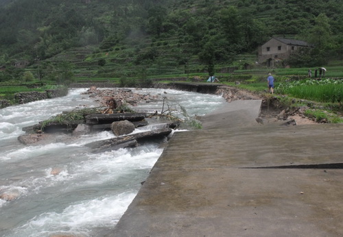 受“莫拉克”台风影响,上郑乡干坑村的通村道路有多处被洪水毁,图为最长一处,长达100米。干坑村为该乡受灾最严重的村,另有三处桥梁被冲跨,道路瘫痪,车辆无法通行,该村200多位村民正在乡政府的指导下,正紧锣密鼓的开展生产自救。